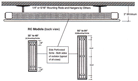 RC model ceiling radiators do not come with any mounting brackets. Typically, installers use threaded rod with locking nuts to secure the panel to the ceiling structure. There are two mounting holes per cross-member stiffener on the back side of the radiator. Each of these mounting points should be used to suspend the radiator, to avoid sagging. It is typically easier to attach the threaded rods to the radiator before raising the assembly to the ceiling for final mounting. Once the radiator is securely fastened to the ceiling structure, adjust the nuts on the threaded rod to straighten and level the radiator. It is recommended to have at least 3 inches minimum from the face of the radiator to the finished ceiling above it. In cases where upward radiation from the back side of the radiator is undesirable, foil faced insulation can be placed in the cavities created by the perforated steel side channels.