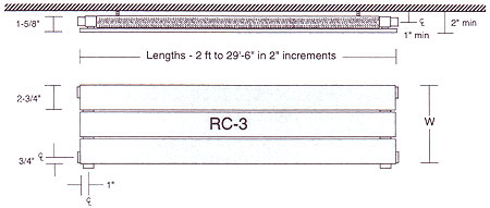 The radiant heating panels shall be available in lengths from 2’-0” to 29’-6” in two inch even increments without the need for splicing. Appropriate ceiling mounting (typically threaded rod) shall be provided by the installing contractor. Panel radiation expansion shall not exceed 1/64” per foot of radiation at 215ºF. The installer shall provide adequate expansion compensation for each radiator.